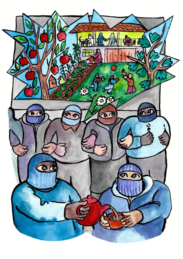 Tired and cold, standing in the rain on a winter morning, but there is a small warmth in a sip of hot tea, in the linked arms of your friends. The hot sip of tea warms my body like hope that grows, the dream of a world without weapons factories, a dream of what could be here instead, community gardens, really social housing and nothing in scarcity. Let’s all dream over cups of tea, outside the weapons factory, and not only dream but make and do! meet us there.
